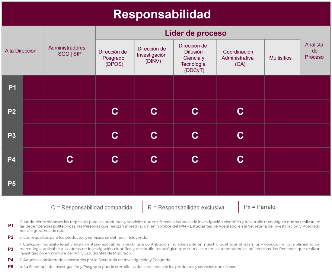 En la Secretaría de Investigación y Posgrado nos aseguramos de que tenemos la capacidad de cumplir los requisitos para los productos y servicios que se ofrecen a las áreas de investigación científica y desarrollo tecnológico que se realizan en las dependencias politécnicas, las Personas que realizan investigación en nombre del IPN y Estudiantes de Posgrado.